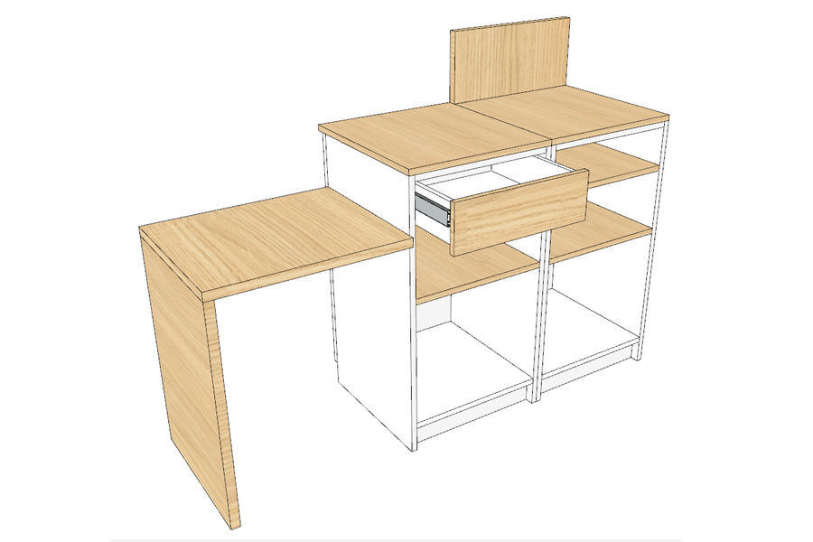 Modules en mélaminé « Egger » blanc. Plateau et arche en mélaminé « Egger Chêne Vicenza » épaisseur 19 mm. Il dispose d’une étagère réglable par module en mélaminé « Egger Chêne Vicenza »,1 tablette PMR arche en mélaminé « Egger Chêne Vicenza » et 1 tiroir sur galets.